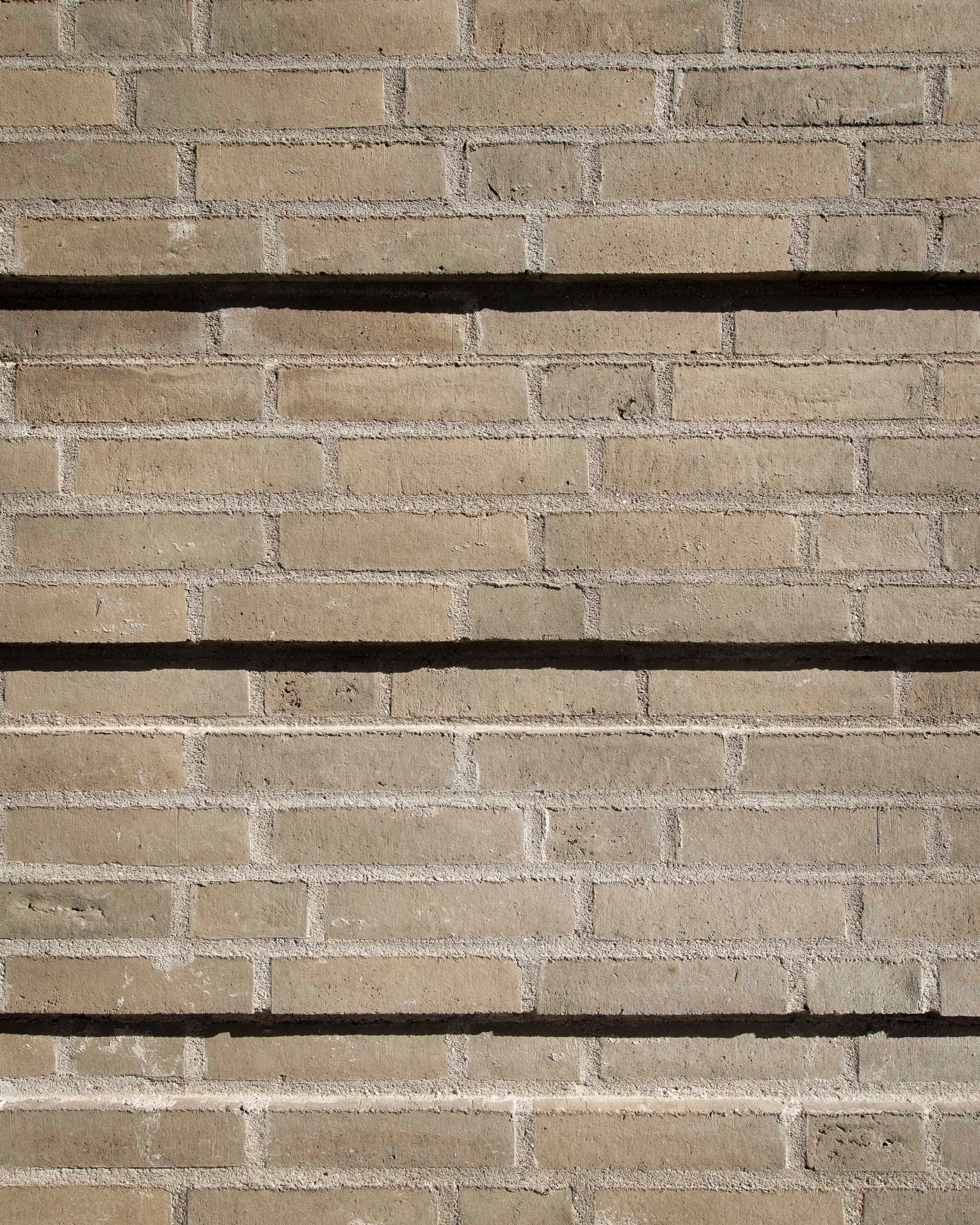 Tagstenene er rektangulære, stramme og danner vandrette linjer, ligesom hver 5. skifte mursten er trykket 2 cm ind, for at give en skyggevirkning, og fremhæve det vandrette.